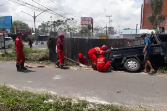 Mobil Bermuatan Besi Masuk Parit di Jalan Yos Sudarso, Dievakuasi Damkar