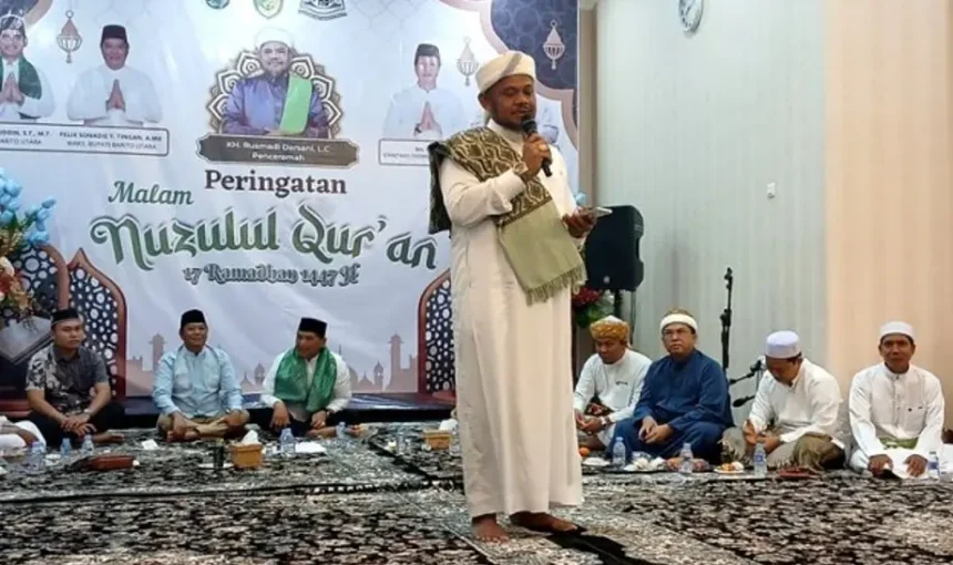 Muara Teweh – Peringatan Nuzulul Quran yang digelar di rumah jabatan Bupati Barito Utara pada Jumat (6/3) berlangsung penuh kekhusyukan. Momentum tersebut dimanfaatkan untuk memperkuat keimanan, terutama dengan mengisi sisa bulan Ramadan melalui berbagai amalan terbaik.